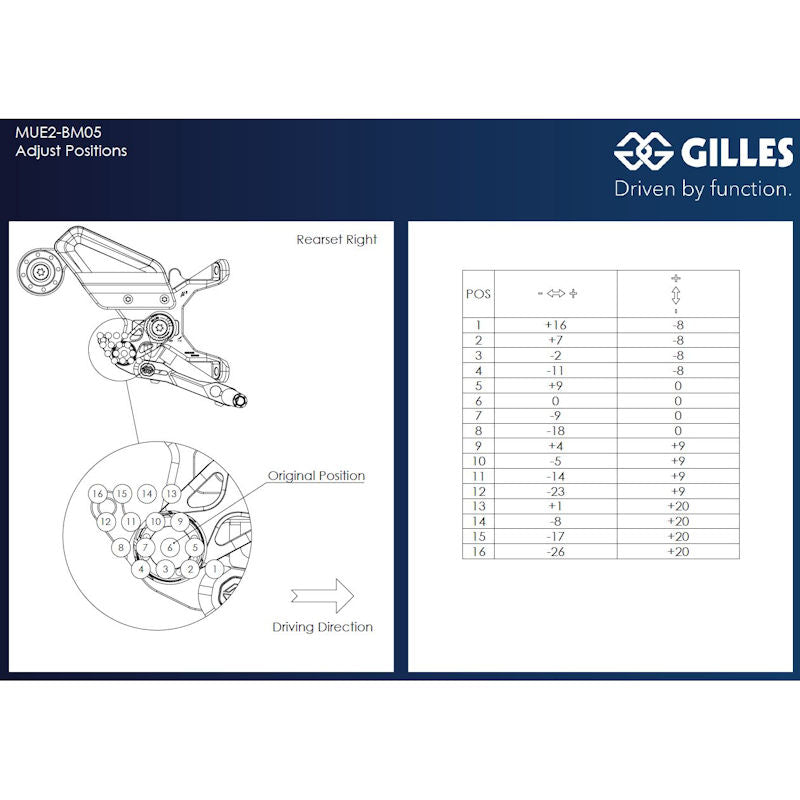 Gilles Tooling MUE2 rear sets are fully adjustable to fit riders of all sizes. The unique proprietary design of these rear sets allow maximum performance at minimum weight while having a beautiful aesthetic design. The main rider foot pegs are foldable.