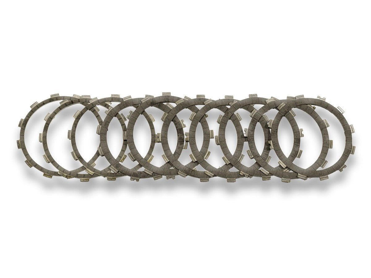 Clutch disc kit featuring aluminum-supported friction discs and high-performance steel plain discs. The friction material provides superior characteristics compared to OEM stock discs, ensuring greater durability, enhanced performance, and a more responsive feel in all riding conditions.