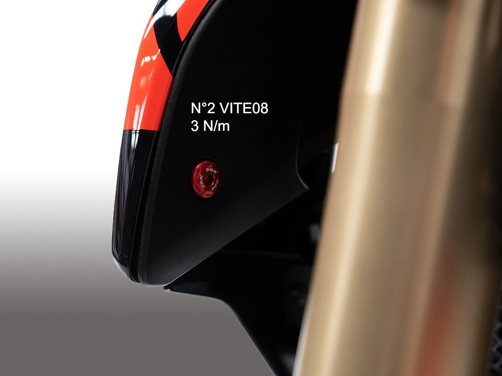 Kit of screws made from solid aluminum alloy (Ergal 7075) through high-precision CNC machining. The screws undergo a colored anodized surface treatment that enhances corrosion and wear resistance, while also providing a sleek and customized look. This kit offers a combination of lightness, durability, and style for your motorcycle, ensuring high performance and a distinctive appearance.
